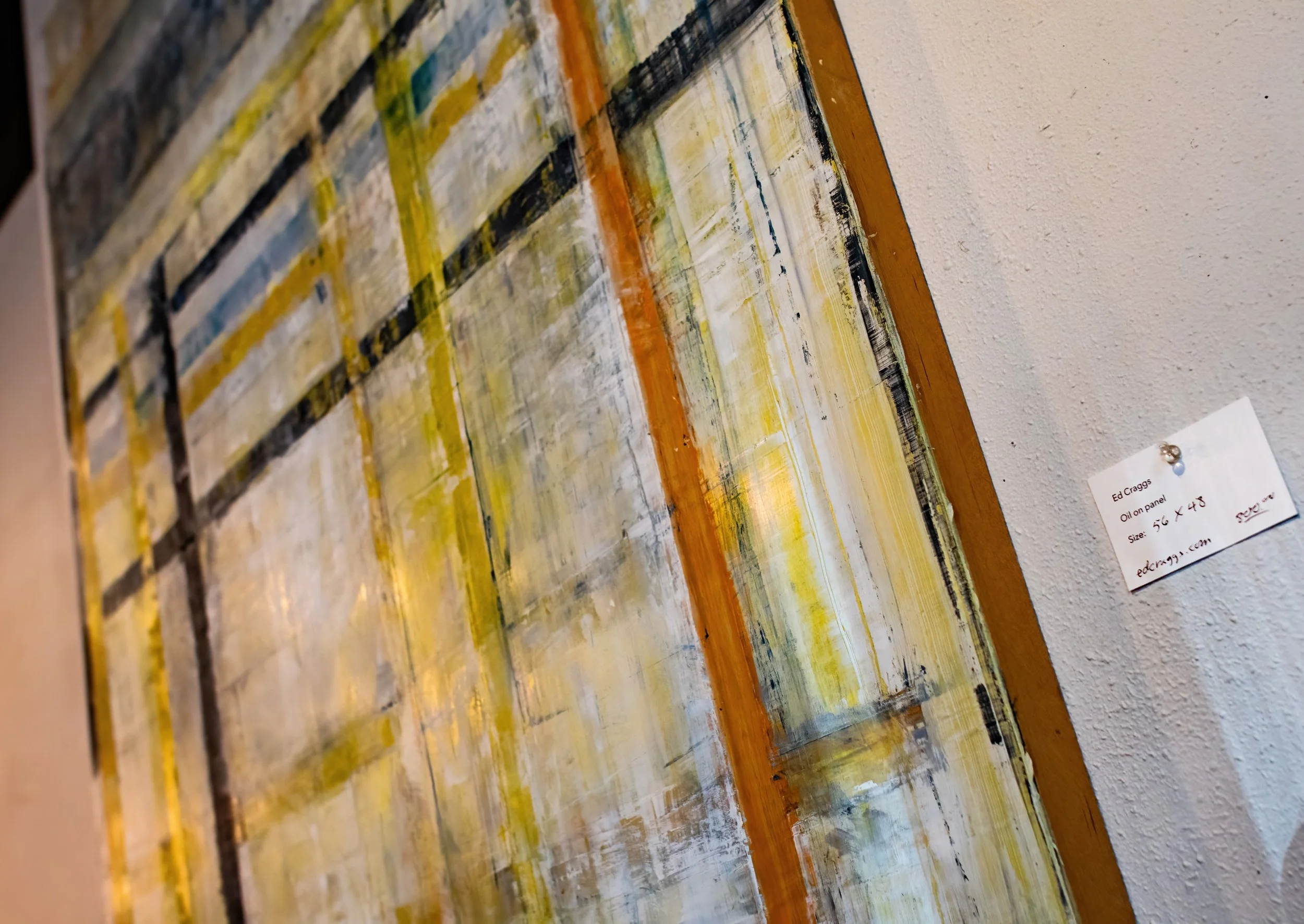 In a resounding abstract artist theme, Ghost Note Coffee’s early 2025 artist exhibit is by abstract artist Ed Craggs. Cragg’s abstract art is heavy with color blocking. The various blocks are overlapping and squeezed into the confines of the canvas. Pieces within his #1s and #60s series jump off the boundaries of average canvas and spill over into their own custom panels of superimposed and brimmed color. In his earlier collections, each of the color blocks are their own distinct projects with individualized attention and richly unique texture. In his 2020s paintings, the artist moves into softer blending and texture sharing between the batches of color.