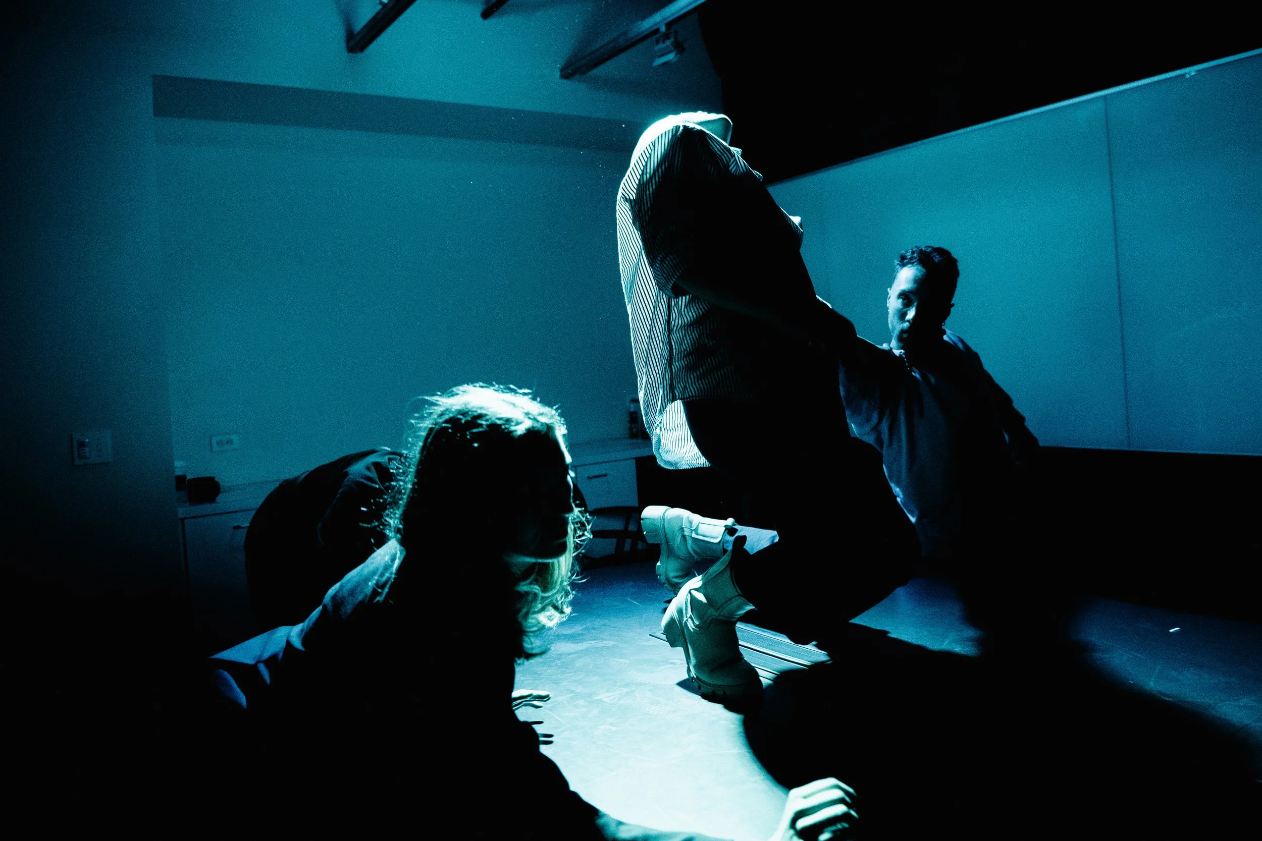 While audience members shuffled through the set pieces, performers slowly strode into a conference room set within the far wall. The room illuminated, the glass acting as a transparent scrim, setting a slight proscenium effect in an otherwise fully immersive space. Through mimesis and contemporary dance, the performers (Ashley Menestrina, Carol Davis, maia melene d'urfé, and Michael Arellano) loosely mirrored the story that Josiah recited, creating a unique visual accompaniment to the script.